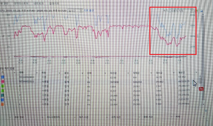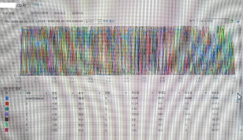 - 아래 서버 CPU 사진 참조 (일부 CPU는 평균값이 30~40% 수준이나, 대부분 Fully 사용 중)