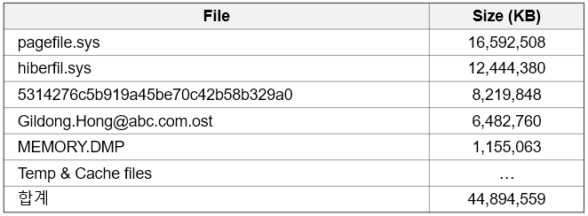 Big Files on C: Windows 운영체제가 설치된 C드라이브 (과거 필자의 PC-Windows 7)에는 상기와 같이 가상 메모리, 메모리 덤프, 아웃룩, 임시 파일 등 사이즈가 큰 파일들이 존재하는데, 이는 대부분 중복 제거와 압축이 잘 되지 않는 바이너리 파일들이다. 또한, 사용자별 로그인을 한 후에는 가상 메모리 파일 (pagafile.sys)이나 임시 파일은 해당 사용자 환경에 따라 독립적인 내용으로 구성되므로 사용자별 고유한 데이터가 된다. 사용자가 MS Outlook을 사용한다면 그 데이터 파일 (.ost)도 마찬가지다. 그리고 이러한 파일들은 C드라이브 전체의 상당 부분을 차지한다. 그러므로 동일한 OS의 사용자 VM이 수백개 이상이라 하더라도 수백대 일이 아닌 그보다 훨씬 낮은 중복 제거와 압축률을 나타내게 된다.