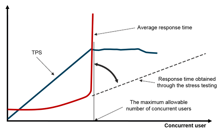 Correlation between throughput and response time 그러나, 부하가 계속 증가하더라도 어느 시점에 이르러 처리량이 더이상 증가하지 않고 일정한 수준을 유지하게 되는데, 이렇게 되는 변곡점을 포화점/임계점 (Saturation point)이라 부른다. 포화점 이후부터는 대기시간 (Queuing time)이 길어지기 때문에 응답시간이 기하급수적으로 증가하게 되며, 사용자가 증가하더라도 성능이 더 이상 올라가지 않기 때문에 이 때의 동시 사용자 수를 최대 허용 동시 사용자라고 표현한다. Saturation point는 해당 시스템의 최대 처리량을 나타내는 지점이 된다.