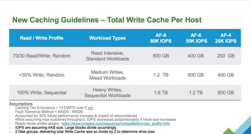 We all know there is a write buffer limit in vSAN but that does not mean you should limit the size of the SSD drives based on that, the main reason is to increase the endurance of the drive, vSAN will cycle through all the cells on the drive irrelevant of the Write Buffer Limit.? VMware recently published a new sizing guide for All-Flash which is shown below