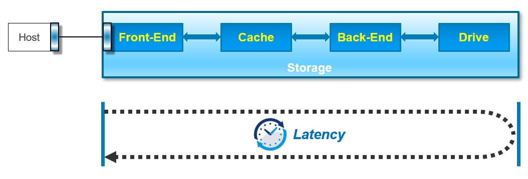Latency 즉, 호스트 (서버)I/O가 스토리지에 도착하는 순간부터 Cache 메모리를 거쳐 실제 물리적인 디스크의 데이터를 Read/Write 하고, 그 결과를 다시 HBA (Host Bus Adapter)를 통해 외부 (호스트)로 내보내기 직전까지의 시간을 의미한다. 즉, Front-End에서 시작하여 Front-End에서 끝나게 되며, Front-End 포트는 Latency 측정의 기준점이 된다.