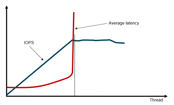 호스트의 I/O Request가 증가할 수록 처리량 (IOPS)이 선형적으로 증가하다 특정 시점에 이르면 더 이상 증가하지 않고 일정 수준을 유지하게 된다. 포화점/임계점 (Saturation point)에서는 해당 스토리지의 최대 성능치 (IOPS)를 확인한 것이며, 더 이상의 부하는 처리량을 증가시킬 수 없고, Little's law에 의해 Latency만 증가하게 된다. (IOPS = Threads / Latency)