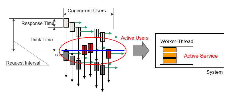 동시 사용자 접속되어 있는 사용자 중 특정 시점에 시스템을 사용하고 있는 동시 사용자 수는 상기의 그림과 같이 카운트될 수 있다. (빨간 점) 여기서 Active user 수는 동시 사용자 수에, 응답시간에 요청 주기 (Request interval)를 나눈 값을 곱하여 구할 수 있다. 또한, Little's law를 통해 시스템이 단위 시간당 처리하는 트랜잭션량을 구하면, 동시 사용자 수에 요청 주기를 나누는 것으로 가능해진다. 그러므로 동시 사용자 수를 알고 그 사용자들의 평균적인 사용 패턴, 즉, 요청 주기를 안다면 해당 시스템의 부하량, 즉, 목표 TPS를 계산할 수 있게 된다. (Little's law 참조, performance.tistory.com/3)