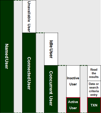 사용자 유형 Named user는 해당 시스템에 존재하는 모든 사용자이다. 즉, Named user 수는 DB에 존재하는 계정의 총 합이다. 이는 성능 관점에서 볼 때 그리 중요한 지표가 아니다. 왜냐하면 모든 사용자들이 그 시스템을 사용한다는 보장이 없기 때문이다. 사용자 계정만 많이 존재하고 실제로 시스템에 접속하여 부하를 일으키는 숫자는 아주 작은 경우가 많다.